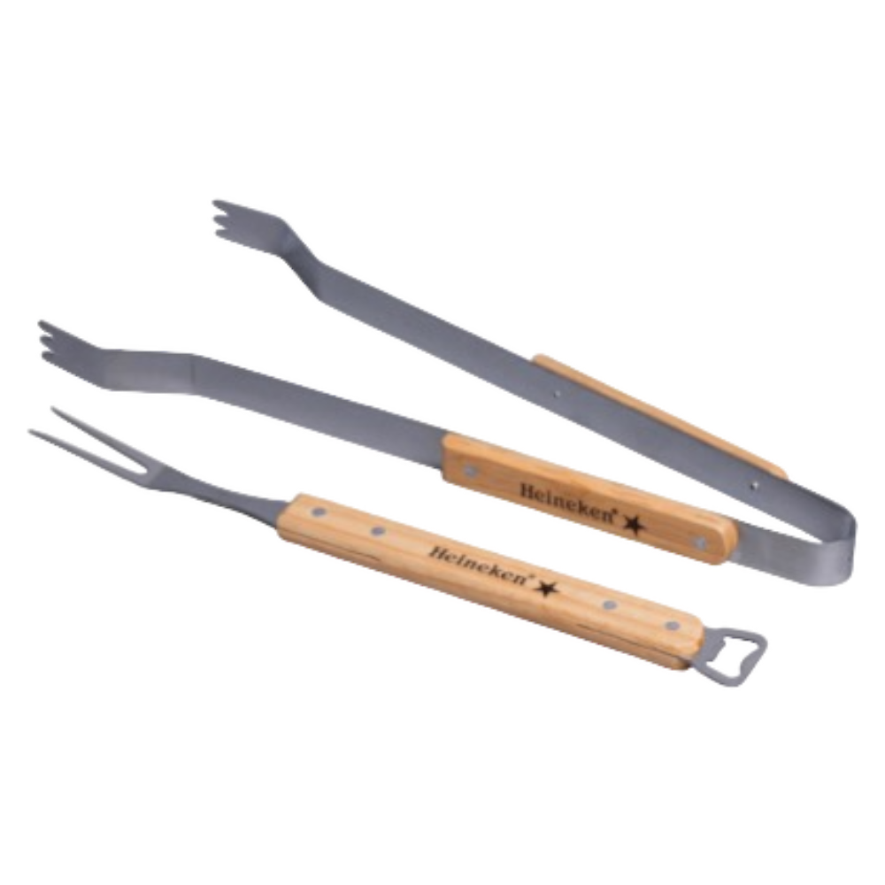 - Heineken BBQ-gereedschap: Het Heineken BBQ-gereedschap bestaat uit een set van diverse hulpmiddelen (klemtang en lange vork bedoeld voor gebruik bij het barbecueën, allemaal voorzien van de Heineken-branding.